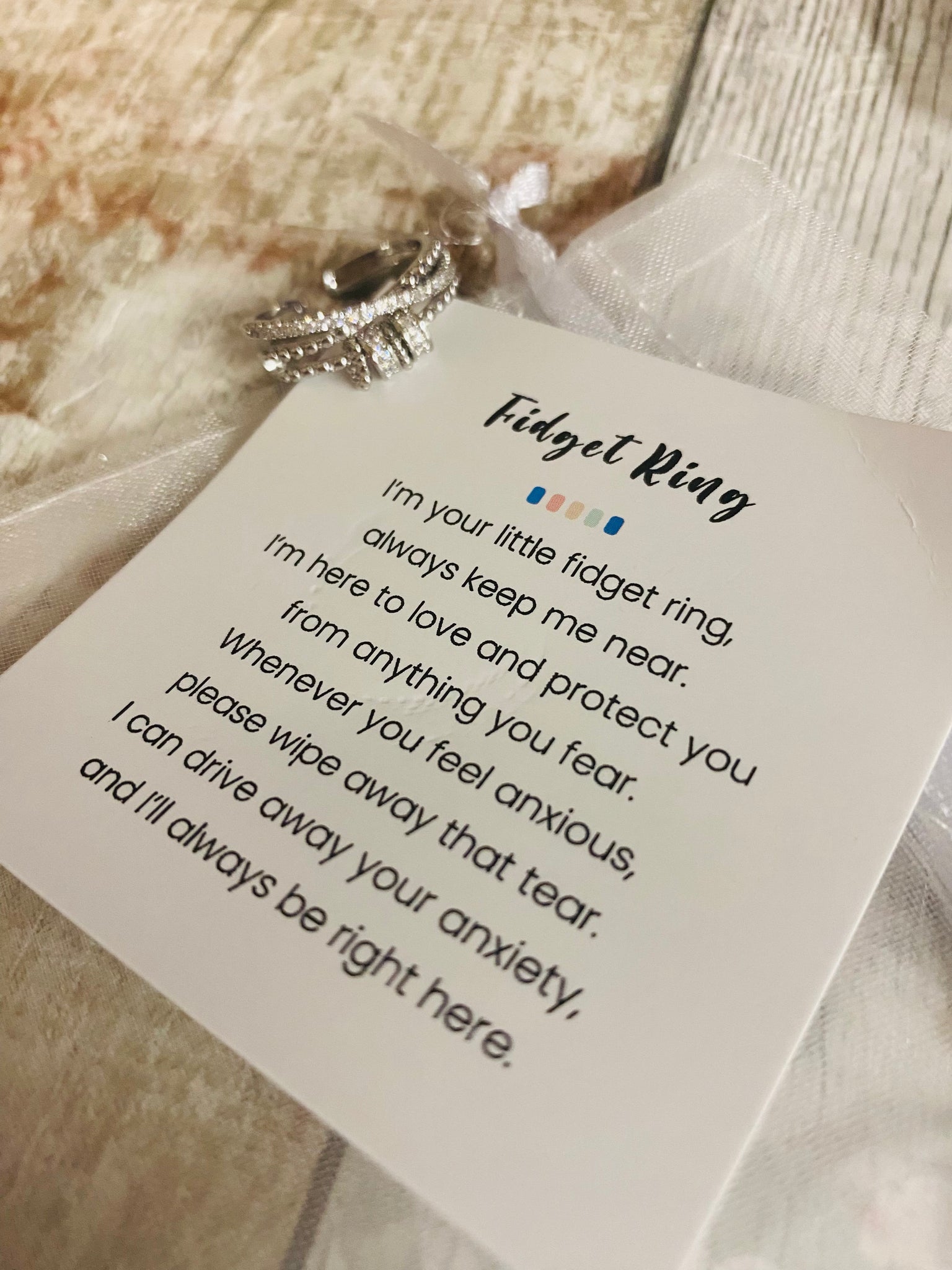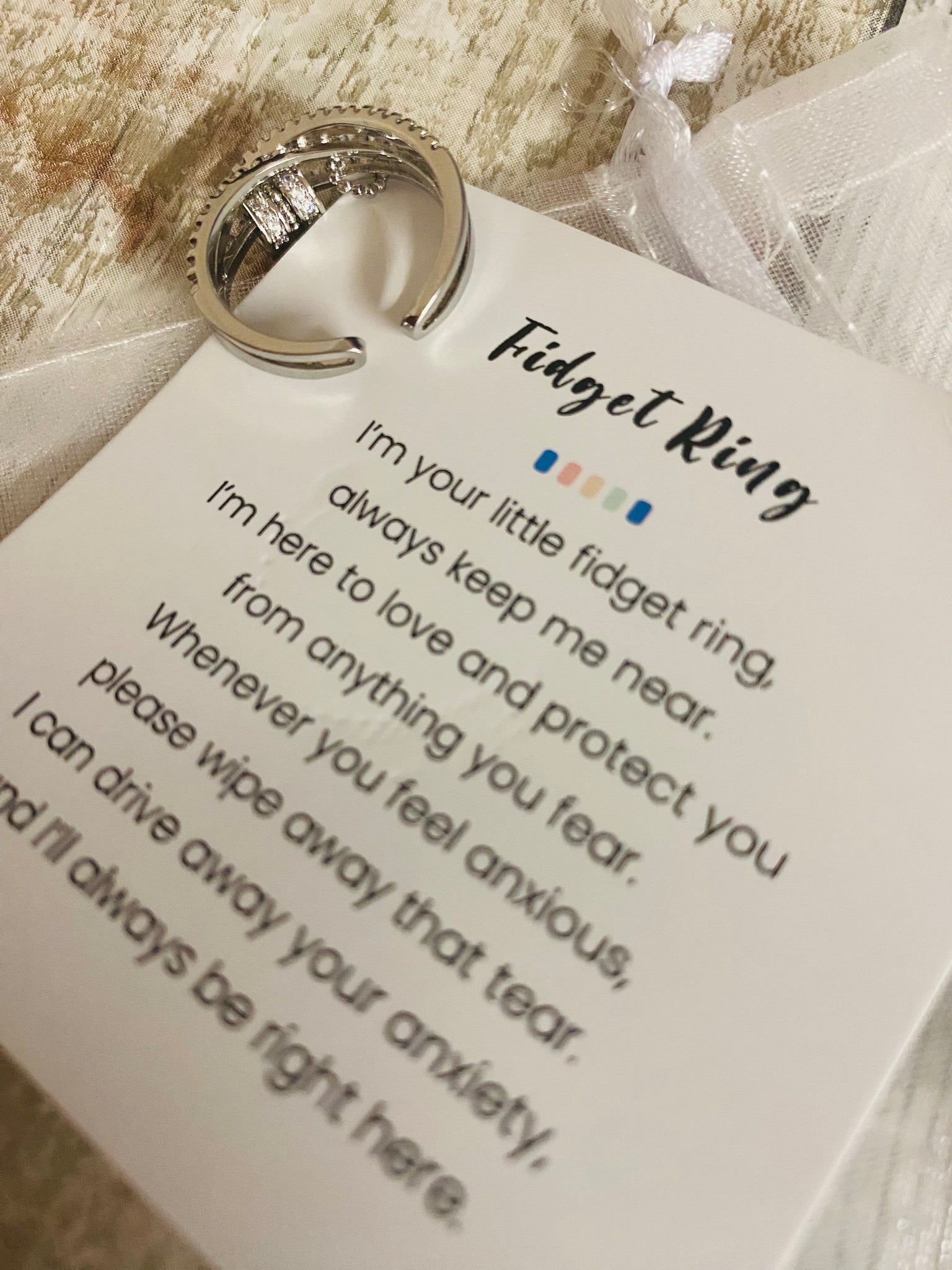A stunning adjustable fidget ring, comes with a backing card and in a organza bag.